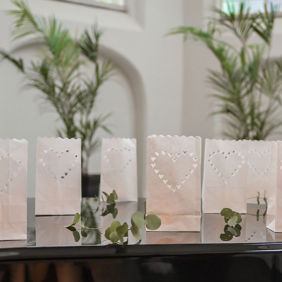 Deze candle bag is geschikt voor toffe waxinelichtjes ter decoratie van houw feestgelgenheid. In het donker worden de hartjes die als patroon in de zak zitten super schattig uitgelicht.