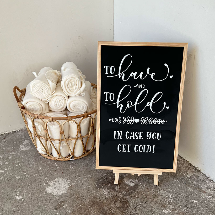 Dit tekstbord voor koude dagen is ideaal voor bij een mand met kleedjes te plaatsen tijdens de ceremonie.